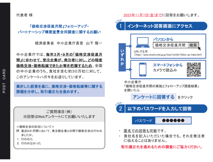皆様の積極的なご回答の1つ1つが、取引適正化を進める大きな一歩になりますので、以下の調査依頼ハガキを受領された方は、ぜひ、アンケートへの回答にご協力下さい。