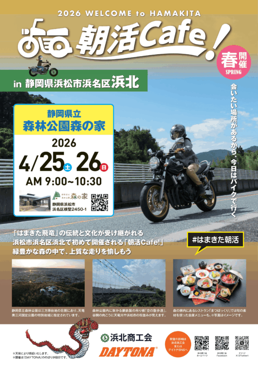 令和8年4月25日(土)・26日(日)に「朝活カフェ」を静岡県森林公園「森の家」で開催いたします。「朝活カフェ」は、株式会社デイトナと浜北商工会など各地の観光パートナー地域団体が運営する、ライダーにツーリングの楽しさと観光による地域活性化を届けるプロジェクトです。